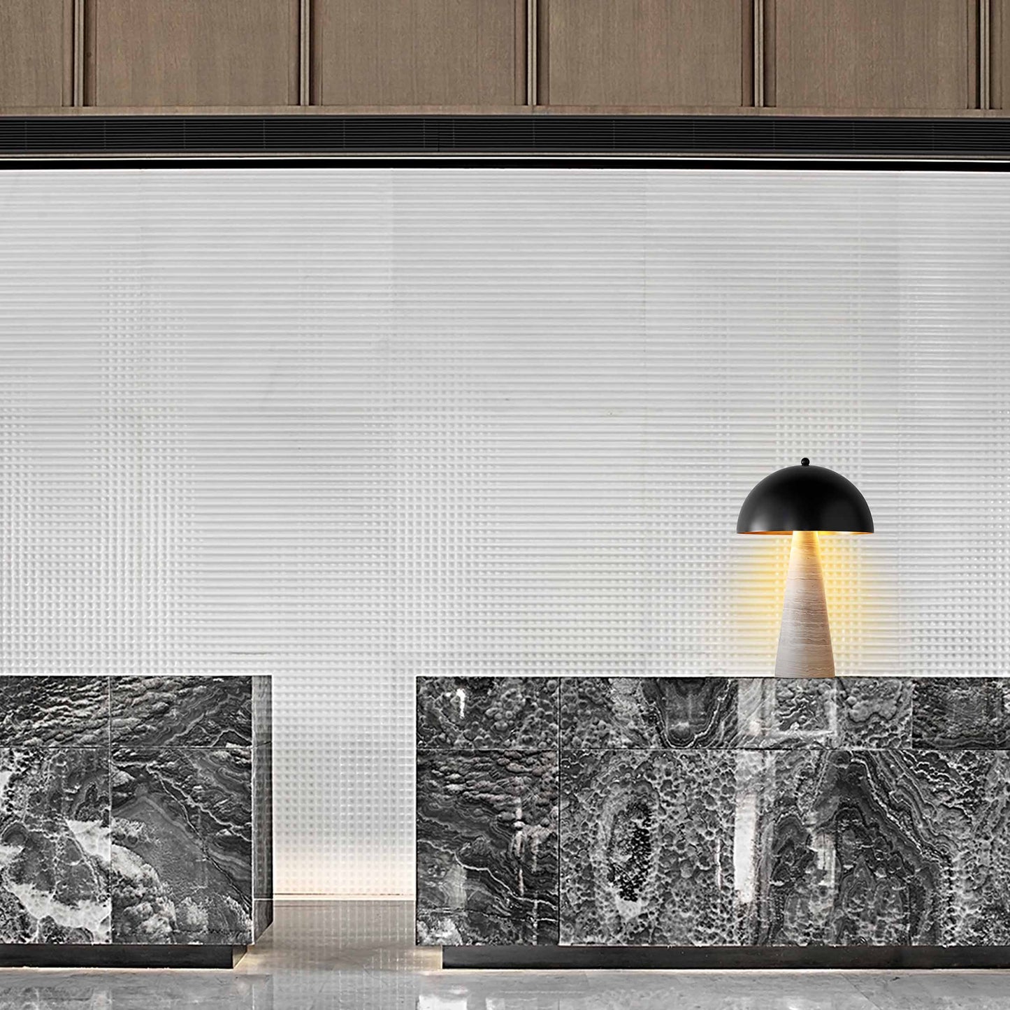 Crafted from gray wood marble and steel, the BRTL3355-L features a rich sense of layers and a textured metal finish that adds depth and character to the design. The natural texture of the marble is a testament to its unique beauty, while the black metal shade provides a striking contrast, creating a harmonious blend of materials.