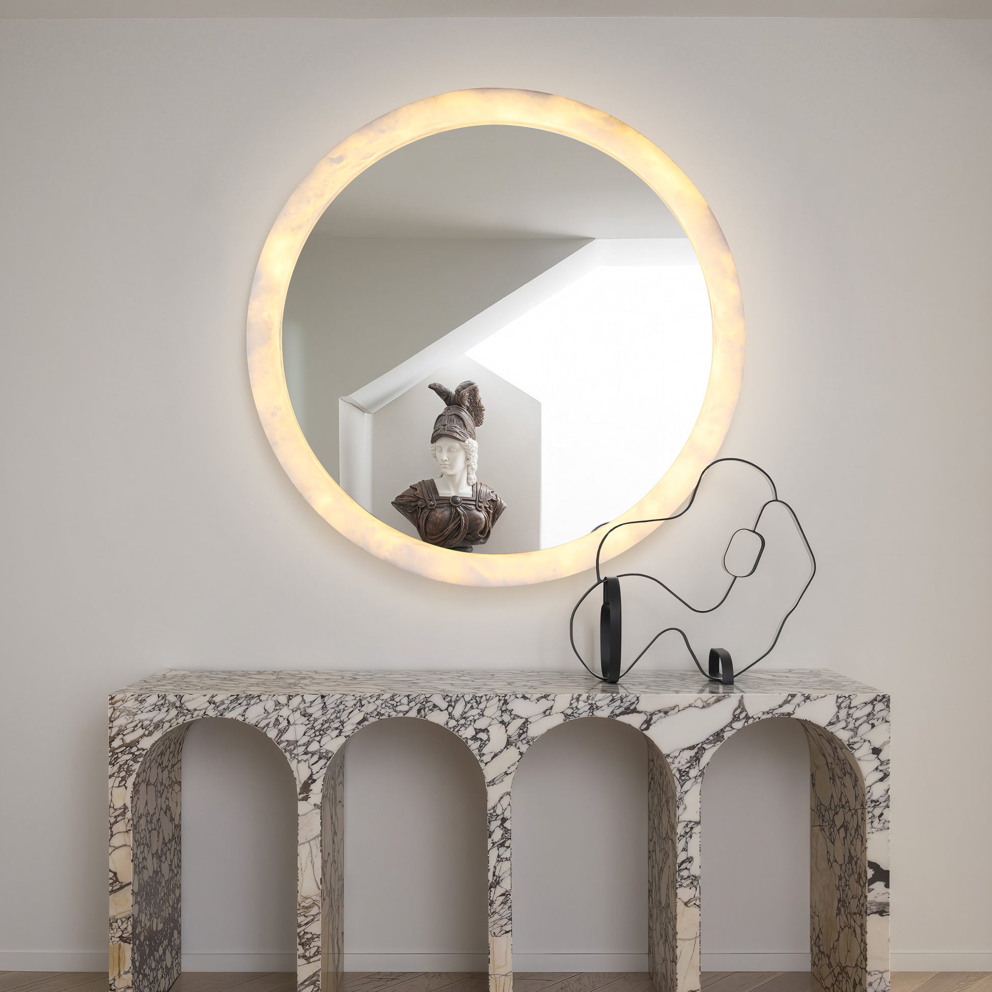 Premium Material Construction: Features thick, genuine alabaster framing with reinforced steel structure and matte white finish, ensuring durability and timeless elegance -