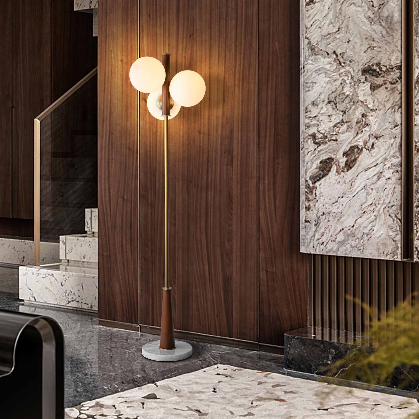 BRFL5029AB 采用橡胶木、大理石、玻璃和钢材制成,配有乳白色玻璃灯罩,散发出柔和温暖的光芒,增强了空间氛围。高品质大理石底座增添了一丝神秘感和复古奢华感,而精致的木质纹理则带来自然而温暖的感觉。