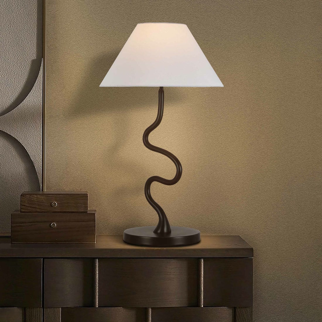 吉祥蛇古铜台灯的设计灵感来源于蛇,蛇是古代图腾,象征着神秘和力量。蛇的动态节奏与现代照明艺术巧妙地融合在一起。灯体的三维形状,线条精致,既体现了力量,又体现了优雅。高品质的铜材料确保了耐用性,并为空间增添了历史和文化感。锥形织物灯罩使整体外观变得柔和,营造出温暖诱人的氛围。