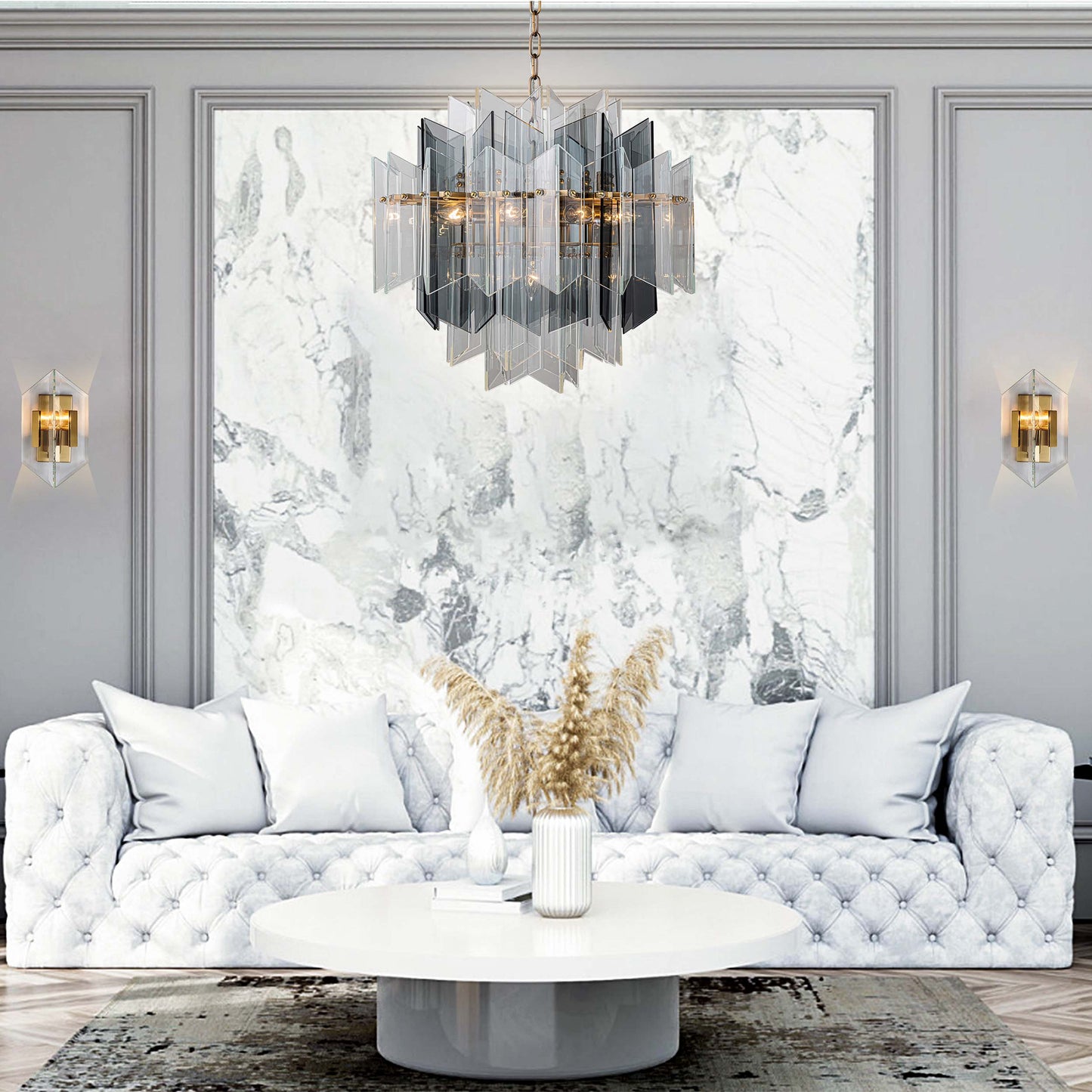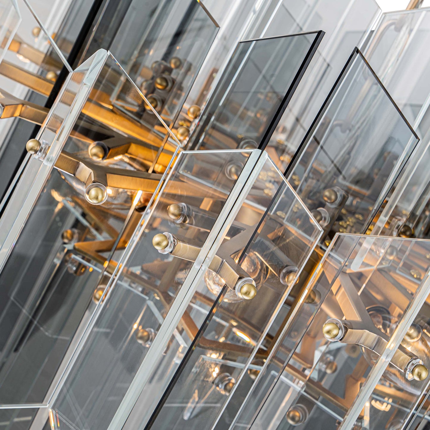 魔幻城市十字系列的灵感源自都市天际线的鲜明几何形状。这款吊灯将棱角分明的黑灰色烟熏玻璃面板与光滑的钢制框架巧妙融合,在工业粗犷与现代精致之间营造出雕塑般的对话。每一个锐利的棱角和交错的几何图案都向城市建筑致敬,将天花板化身为充满活力的艺术装置。